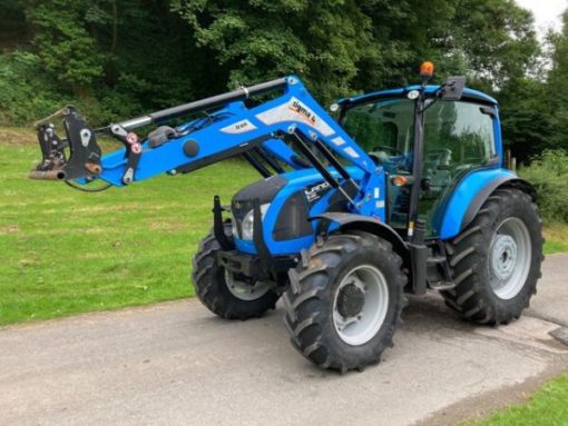 Landini 5-110H Tractor in excellent good condition, year (March) 2017, 4298 hours, Deutz 107HP engine, 40kph 32×16 power shuttle transmission with three-stage powershift, 94L/Min pump, two manual spools, three-speed PTO, push out a hitch, rear-wheel weights, air con, air seat, passenger seat, sunroof. On 380/70 R24 front tyres (40%) and Michelin 480/70 R34 rear tyres (50%). Fitted with Sigma 4 Iron self-leveling front loader with euro headstock and soft ride. Clean and tidy one owner tractor.